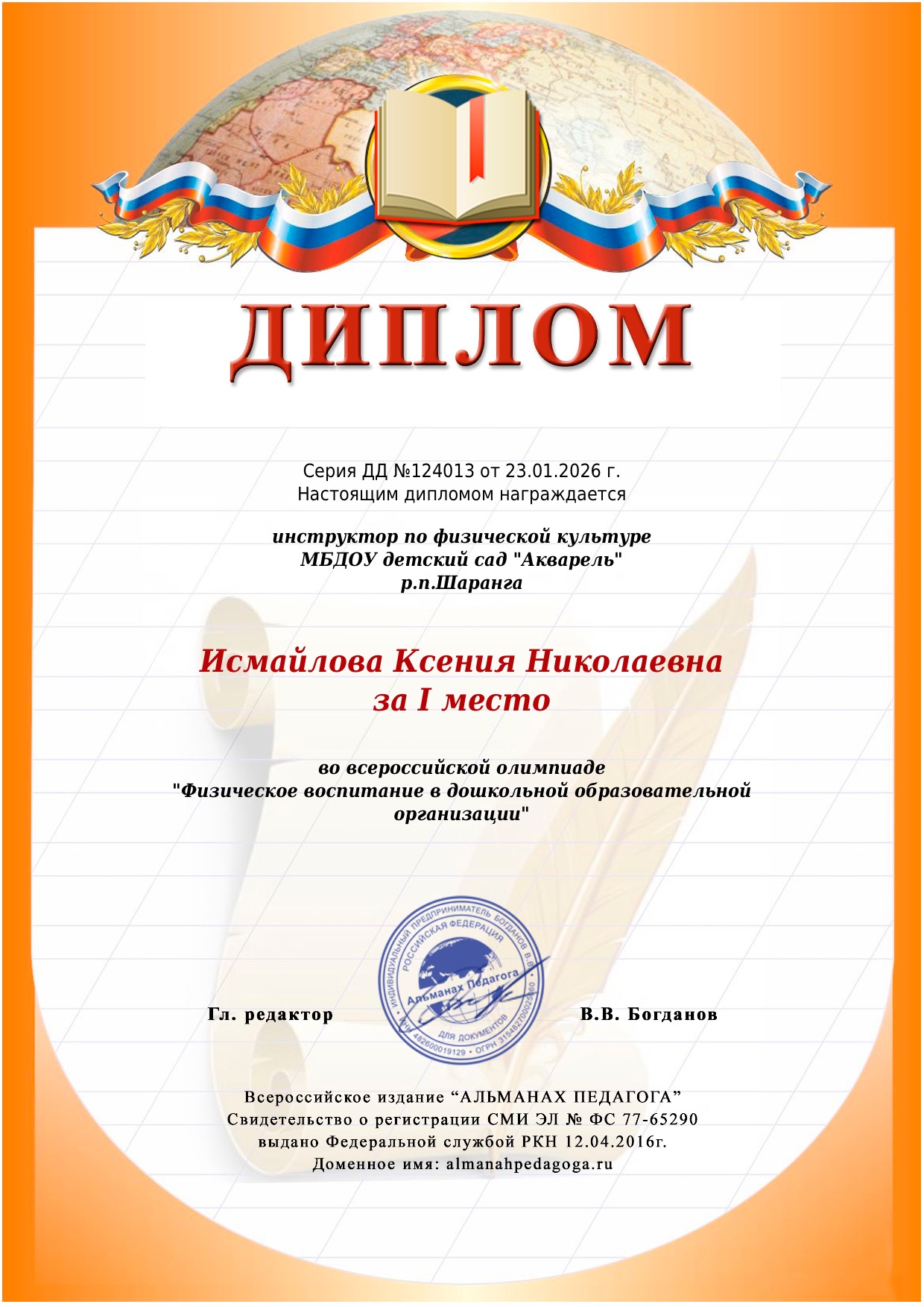 Диплом за 1 место во всероссийской олимпиаде "Физическое воспитание в дошкольной образовательной организации"